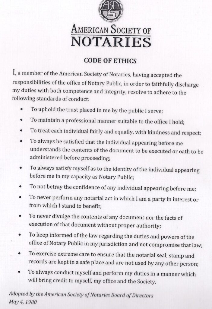 We strive to be the best at what we do while upholding the highest integrity in best practices for the State of Arkansas. We work by the code of ethics and high standards adopted by the American Society of Notaries Board of Directors in May of 1980. We also educate under the highly regarded National Notary Association keeping current with new laws and best practices.